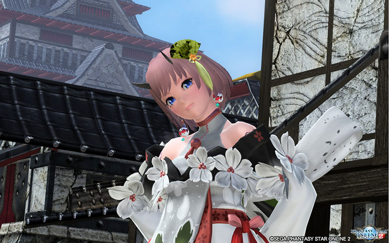 ヒメカブキアーマー雪アクセ:アドオガルホーン、梅ヘアピン白、さいころイヤリング紅白、腰下げ矢筒 黒