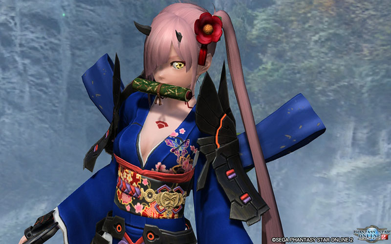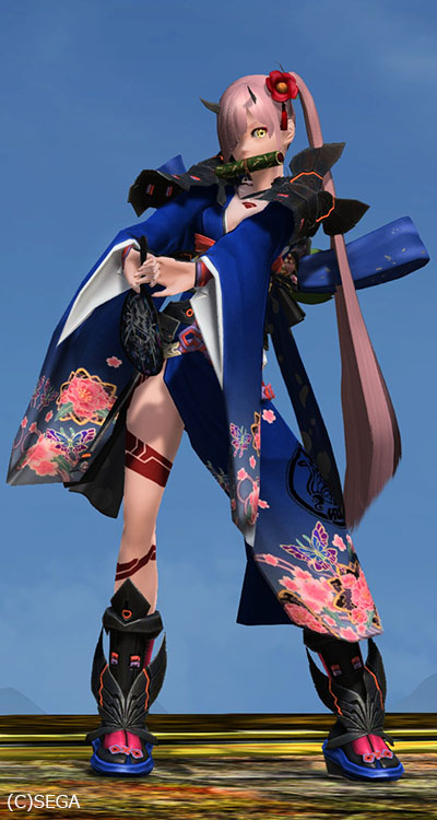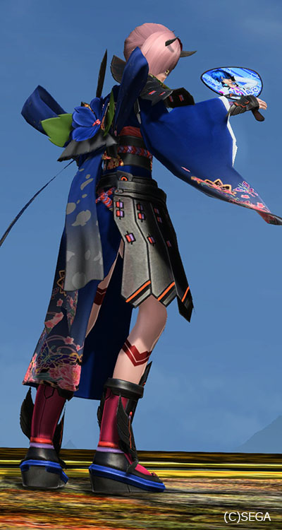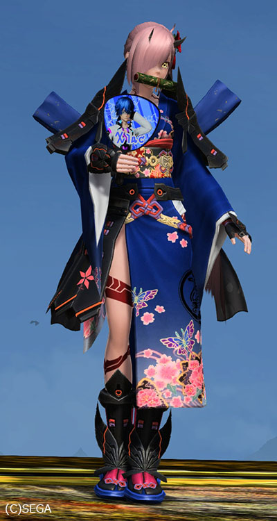 ヒメカブキアーマー夏アクセ:ツバキコサージュ赤、極意の書、カフウ帯飾りB、アイドルうちわシャオ