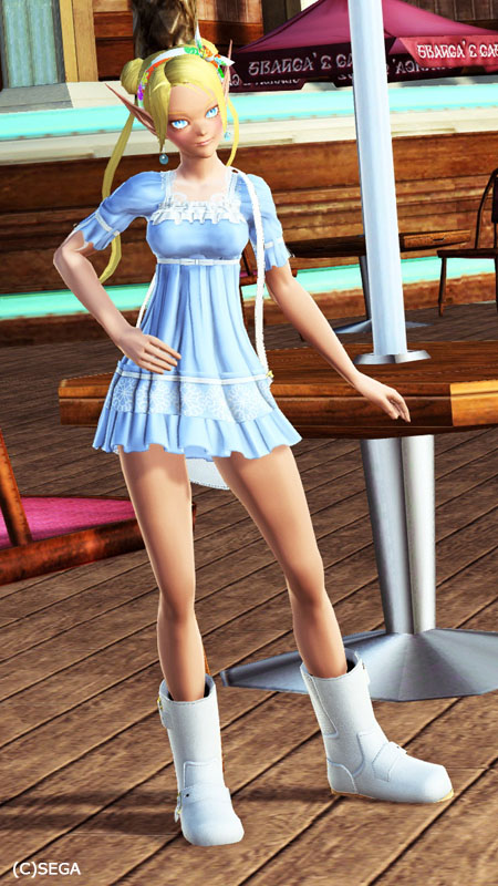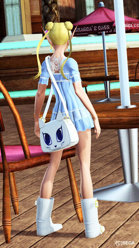 南国風カチューシャ白、貝殻ピアス青、ネコポシェット白、カジュアルブーツ白