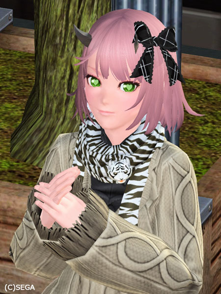 アクセ:シャイニーリボンB、3連ピアスB、タイガーマフラー白、アーガイルバッグ茶